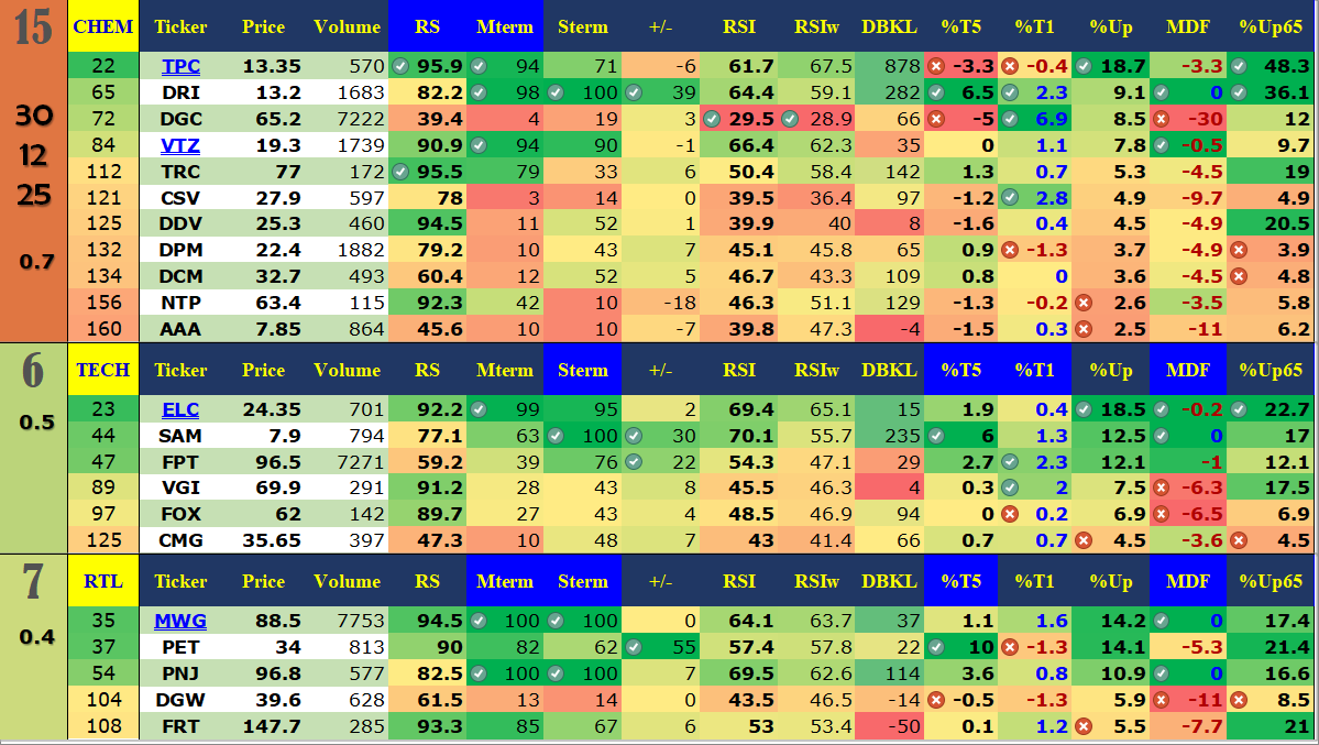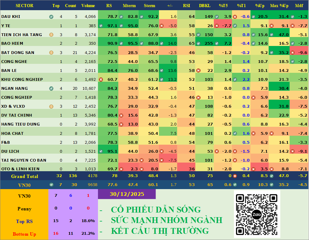 🛡 Lưu ý: Báo cáo đánh giá mức độ lan tỏa dòng tiền và xu hướng tăng giá theo nhóm ngành dựa trên dữ liệu định lượng trong phiên và tuần gần nhất. Không cấu thành khuyến nghị đầu tư. Nhà đầu tư cần kết hợp thêm yếu tố kỹ thuật và cơ bản tại từng mã để ra quyết định phù hợp.